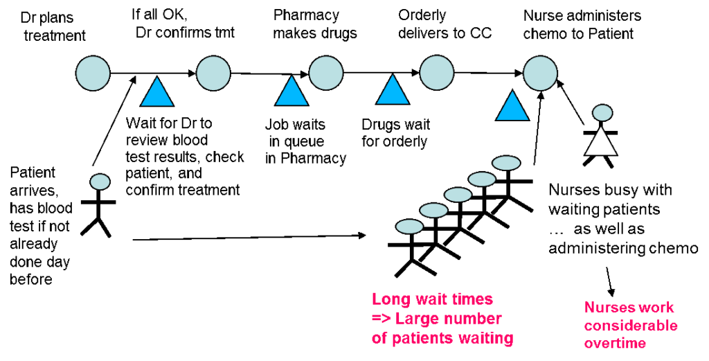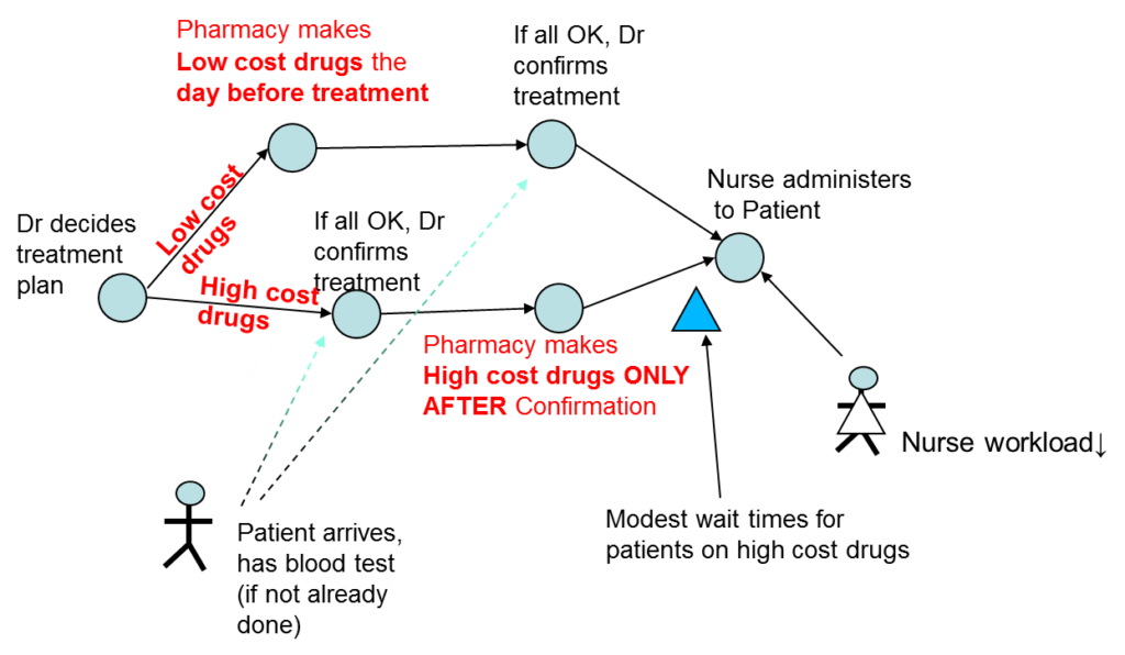 If you think that the only way to improve health services is by adding more resources, think again! The paper describes how we used Theory of Constraints (TOC) to address the resourcing issues caused by rising demands and fixed budgets that plague public hospitals everywhere. A pilot implementation changed the decision rules for determining when the pharmacy supplied chemotherapy drugs. This led to an improvement in average patient wait times of 87%, 37% increase in production, two-thirds (67%) reduction in nursing overtime, reduced stress levels, while drug costs were held constant. The resulting two-tier system has been in place and working well for over 12 years.