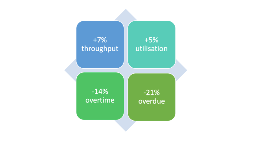 Initial testing of our algorithm-supported approach shows improvement in all key metrics: a 7% increase in throughput, a 5% increase in utilisation, a 14% reduction in overtime and a 21% reduction in operations being overdue.